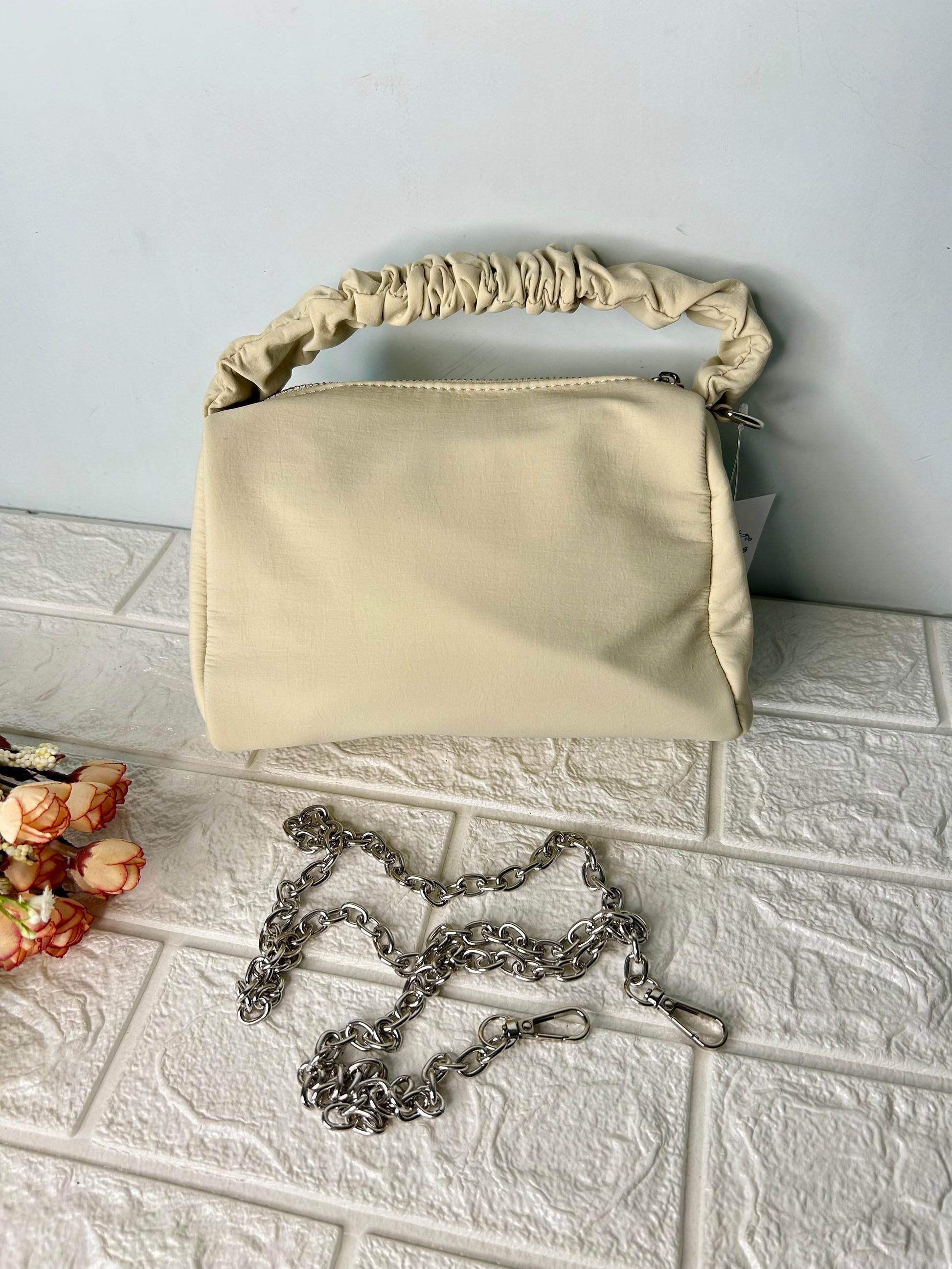 A stylish lightweight bag designed with a soft scrunch handle and detachable metal chain strap for versatile styling. Spacious enough for your phone, wallet, and daily essentials while keeping your look modern and chic. Perfect for outings, travel, and casual everyday use—comfortable to carry and effortlessly trendy.