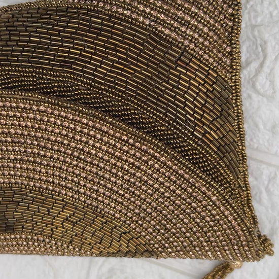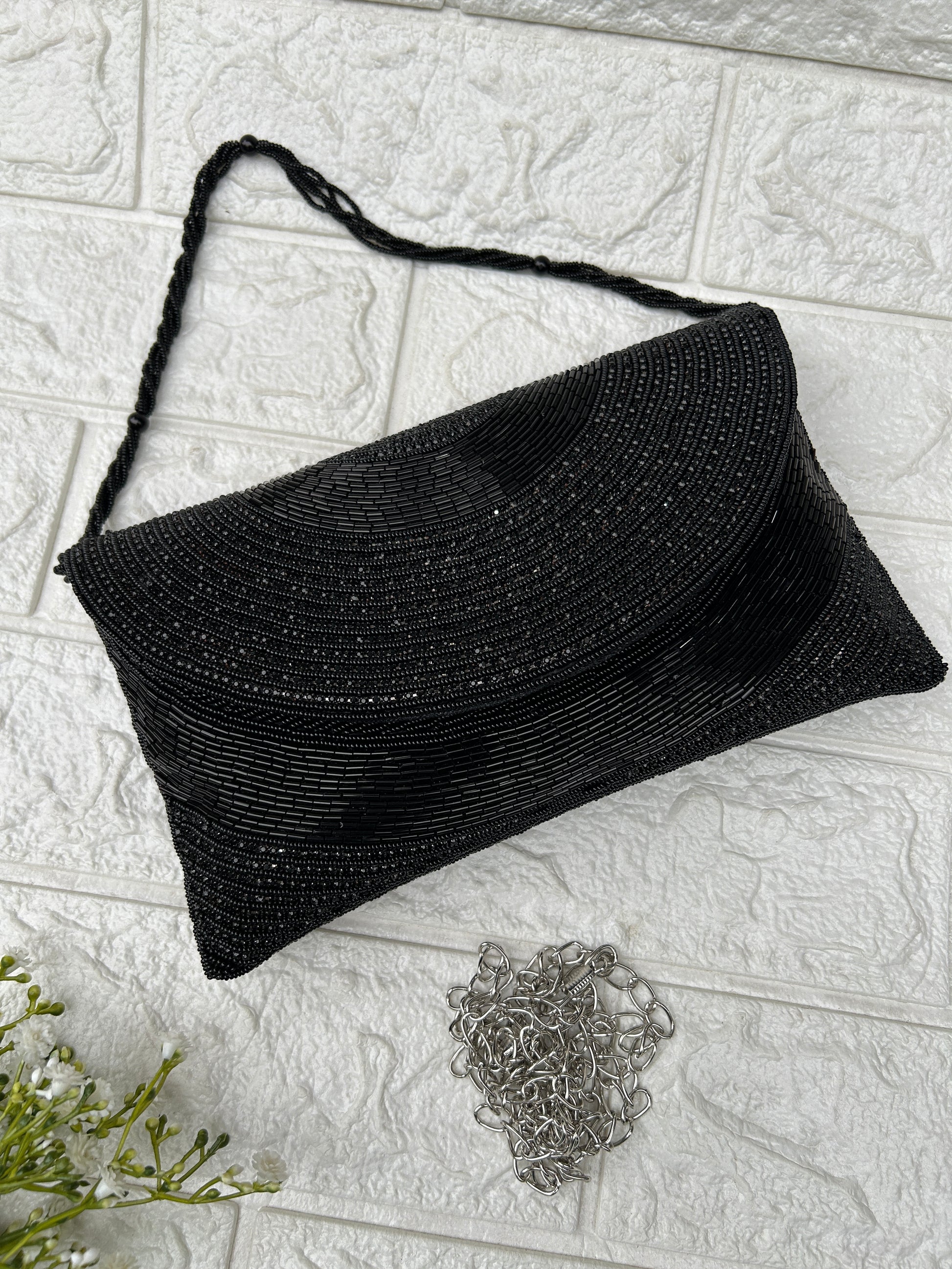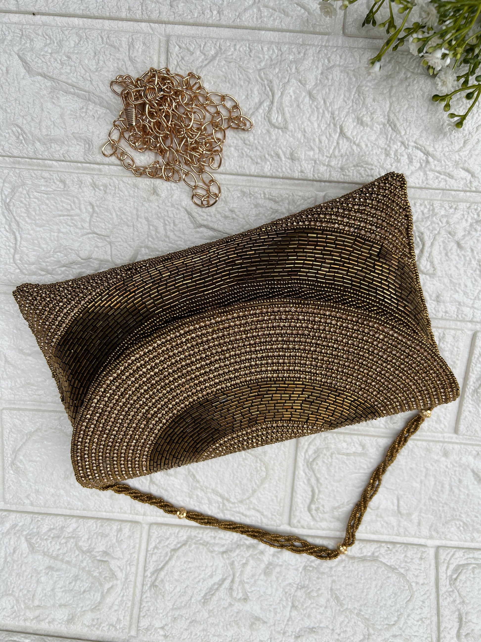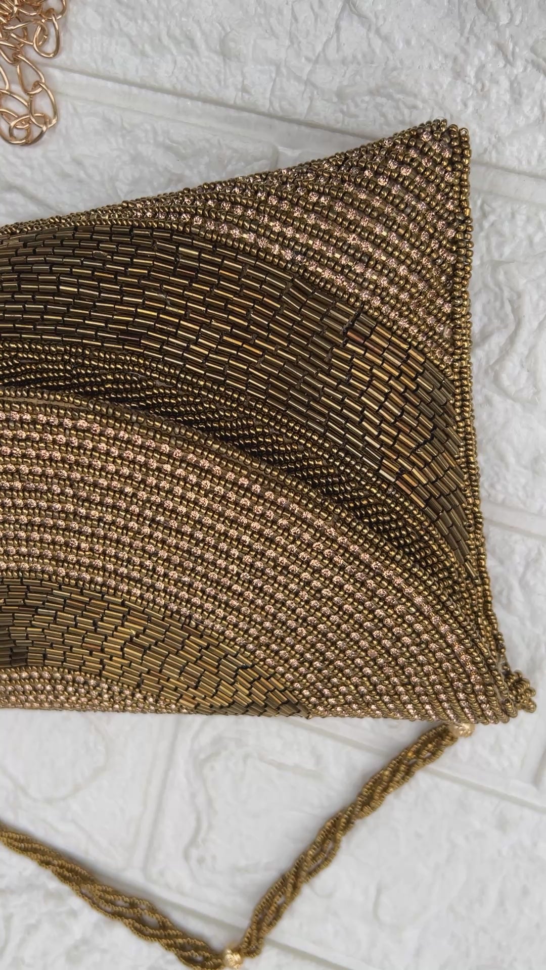 Indulge in luxury with our Glittery bag. Handcrafted with intricate Moti work and a short handle, this clutch bag exudes elegance and exclusivity. Add a touch of sophistication to any outfit with this piece of art.