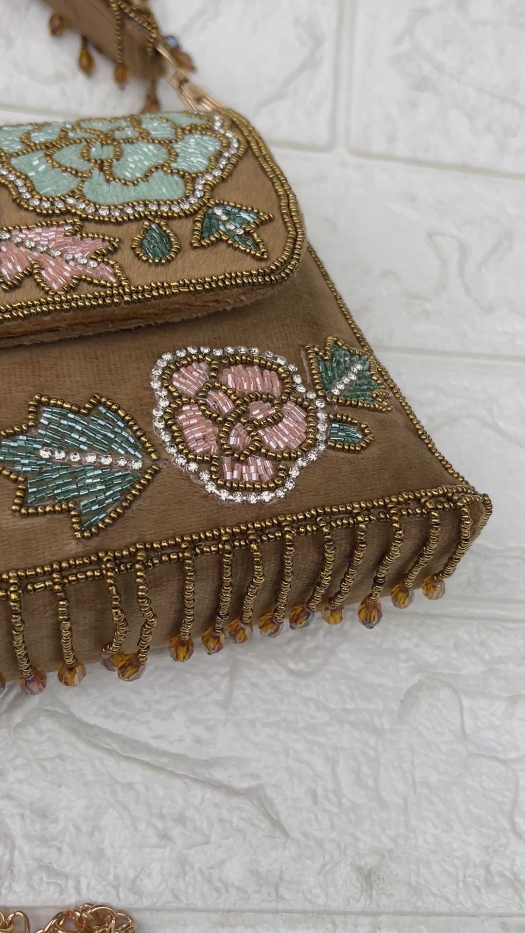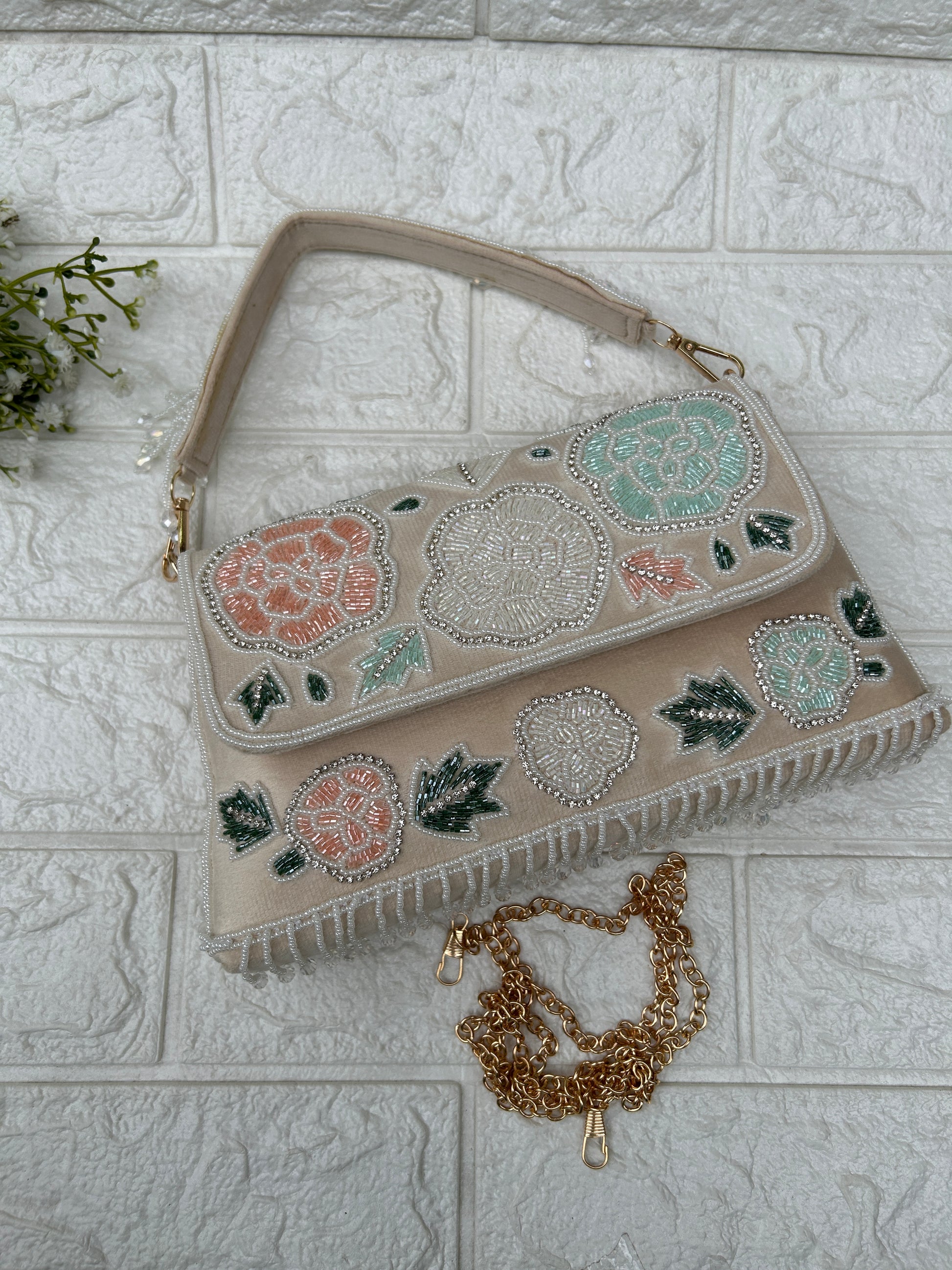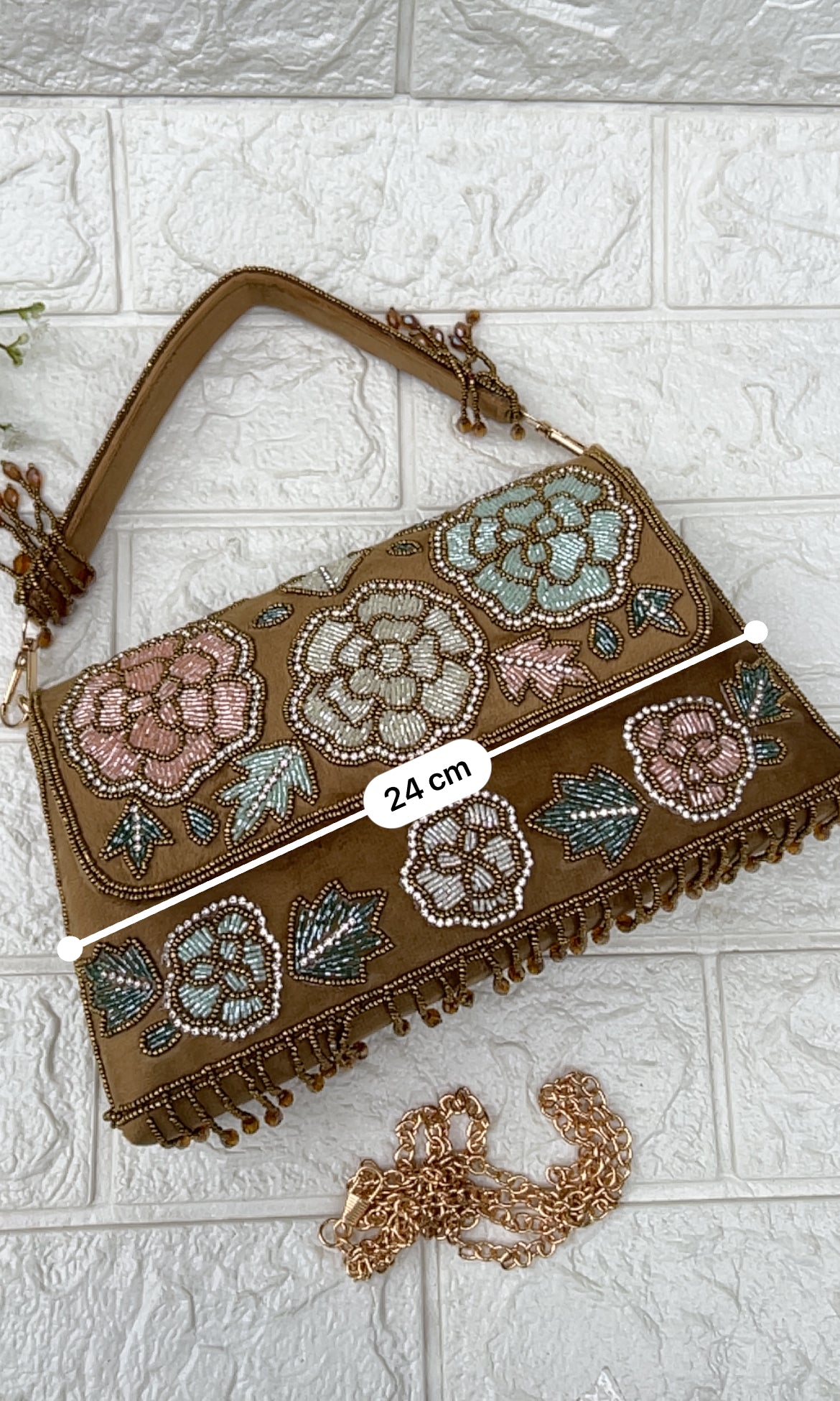 Indulge in luxury with the Noor-2 handwork party bag. Available in 4 beautiful colors, this bag features exquisite handwork and includes a detachable handle for versatility. Perfect for any special occasion, elevate your ensemble with a touch of elegance and sophistication.