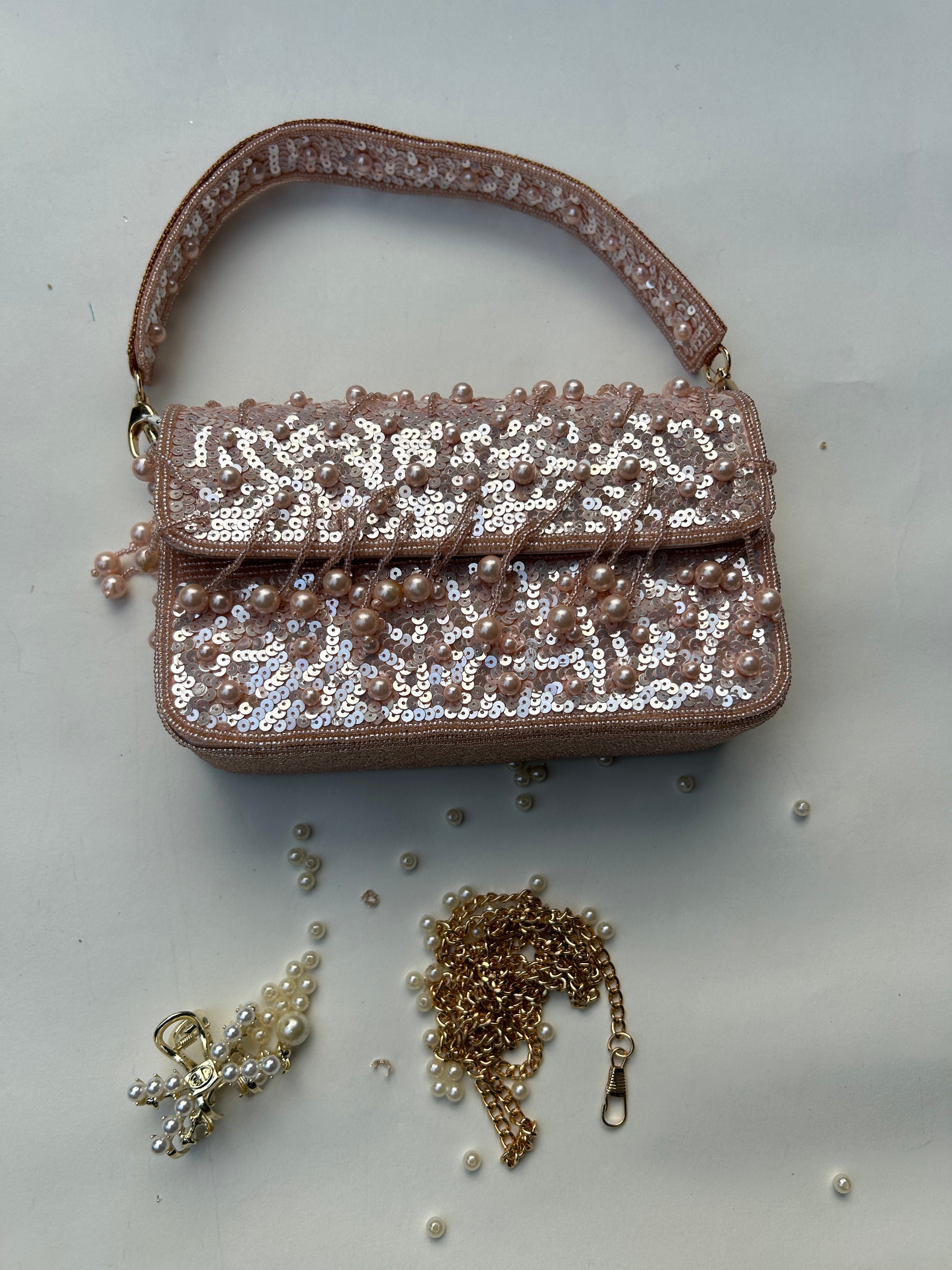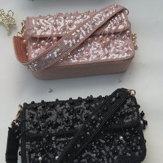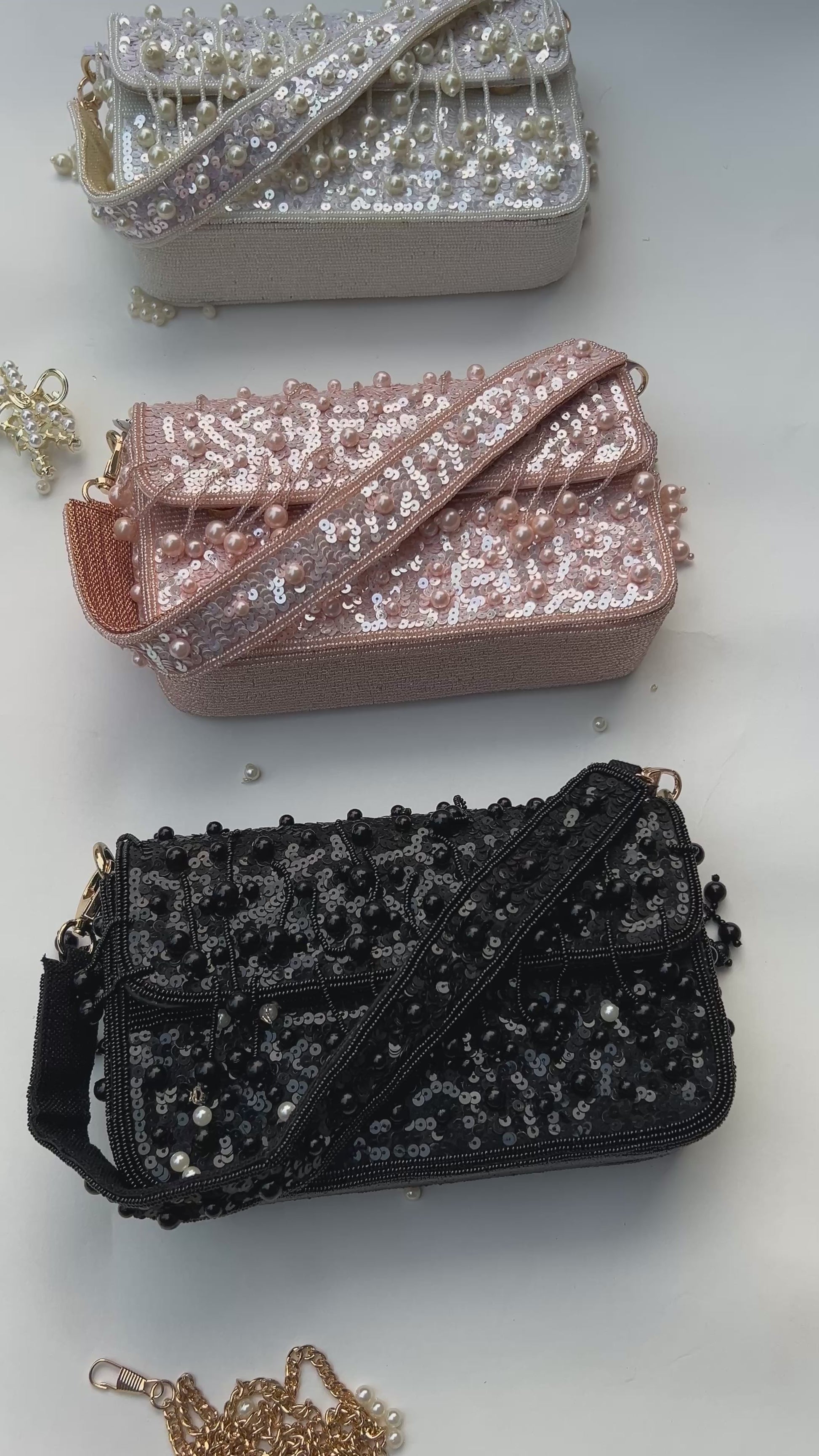 Indulge in the ultimate luxury with our Pearl Glitz clutch. Handcrafted with intricate Call Moti handwork, this party bag exudes elegance and sophistication. The detachable golden metal sling strip adds versatility and convenience to this timeless piece. Elevate any outfit with this exclusive accessory.
