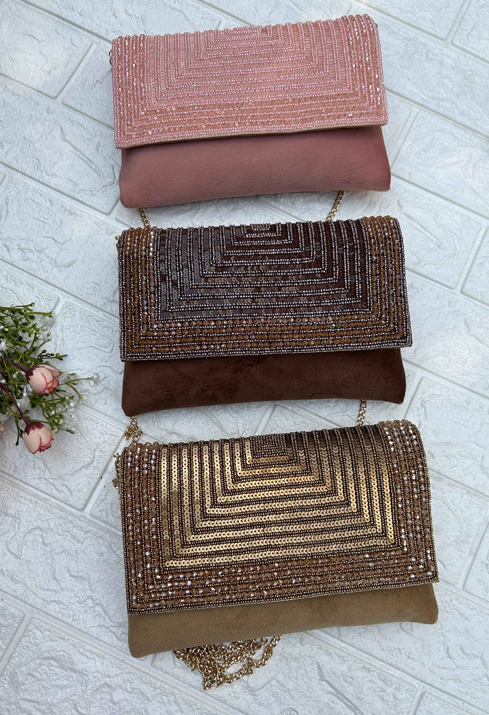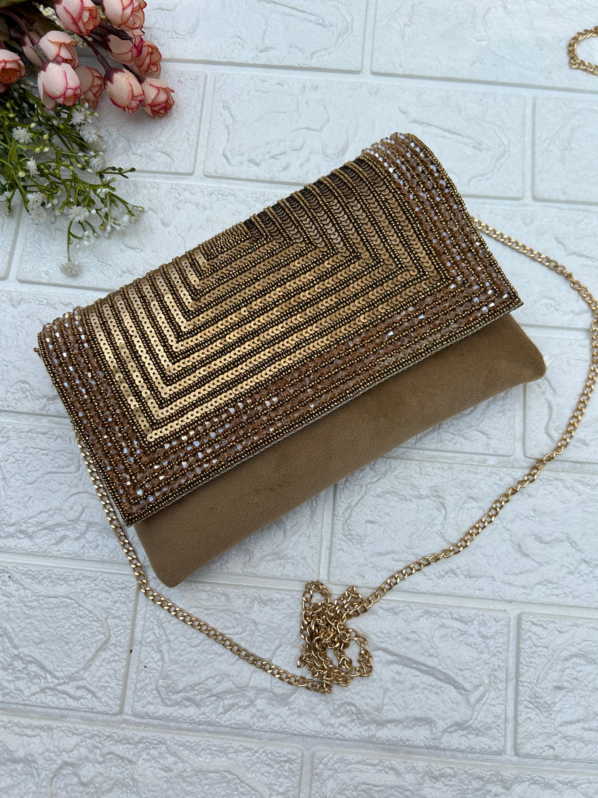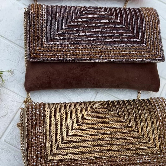 This RimmmZimm clutch is a beautiful and intricate work of art, handcrafted with sparkling crystals and detailed sequins. It features a detachable metal golden color sling strap, making it versatile for any occasion. A perfect gift for a loved one or a must-have for the festive and wedding season.