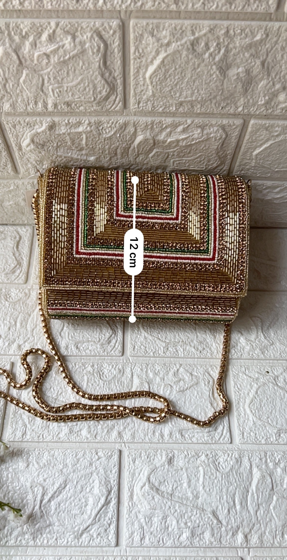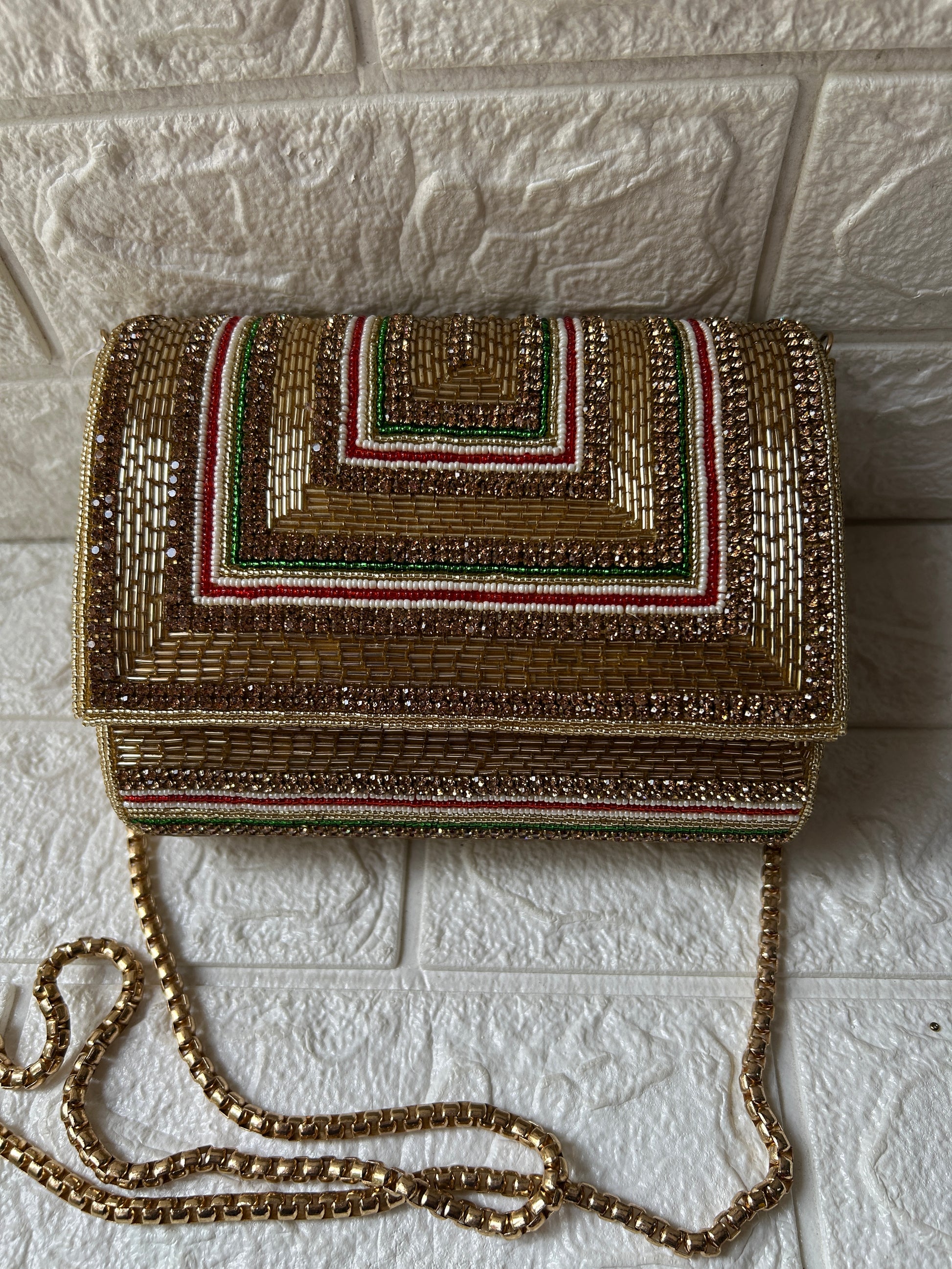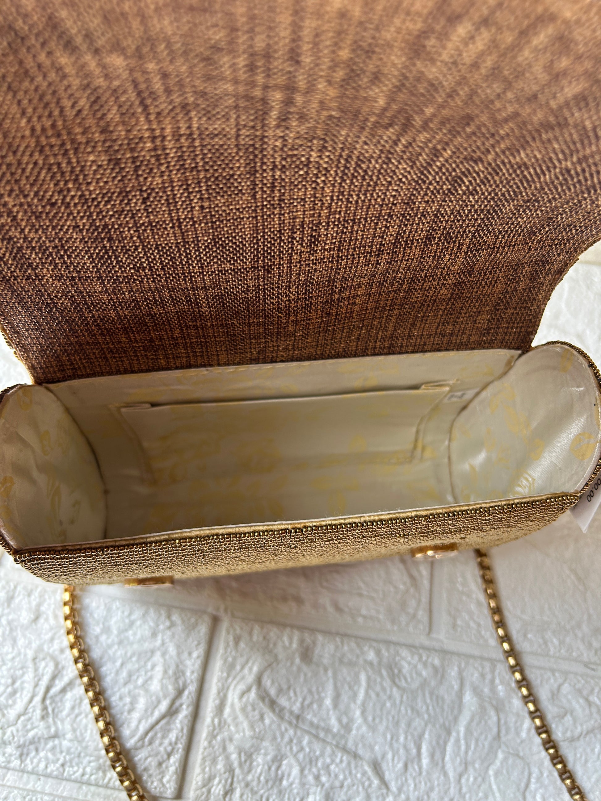 Elevate your look with our Simmer clutch. Handcrafted with beautiful golden and copper accents, this oriental-inspired clutch exudes luxury and sophistication. The detachable sling adds versatility, making it the perfect accessory for any party. Make a statement with our Simmer clutch.