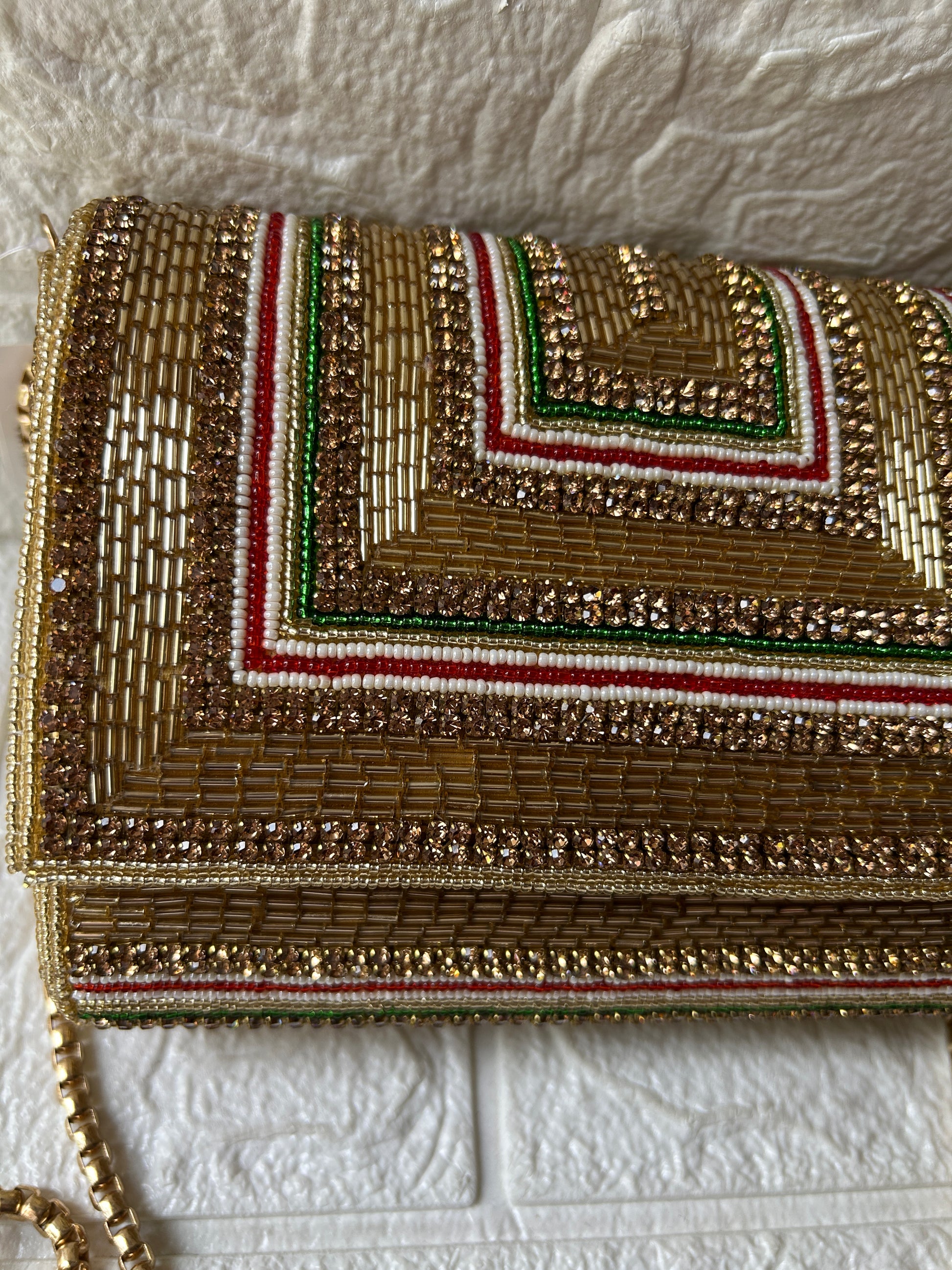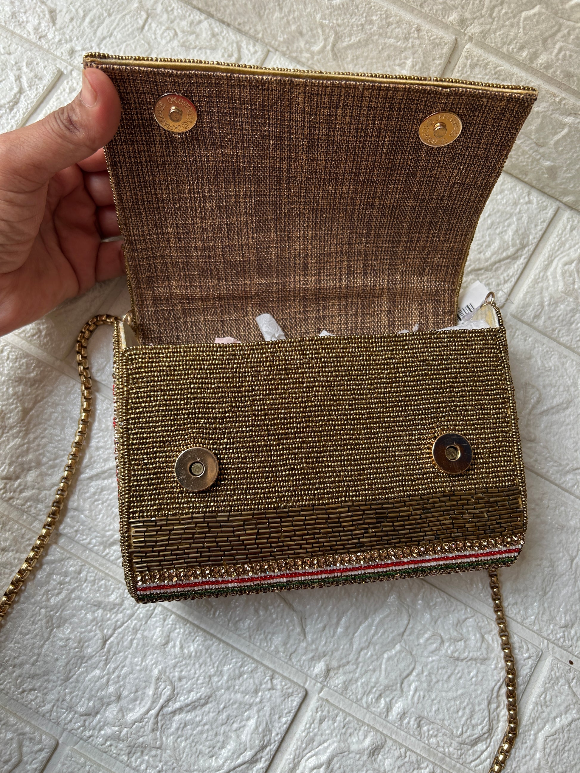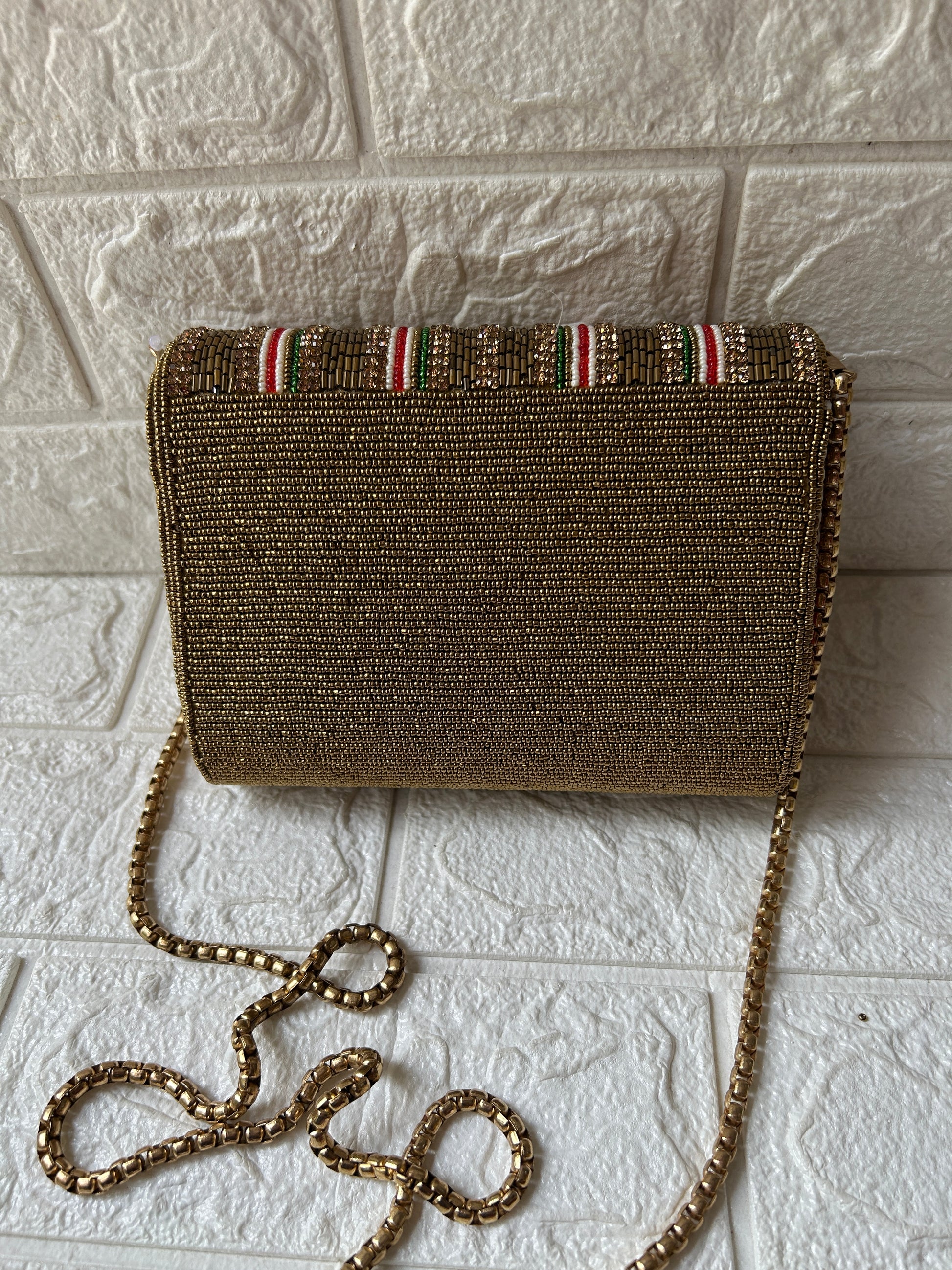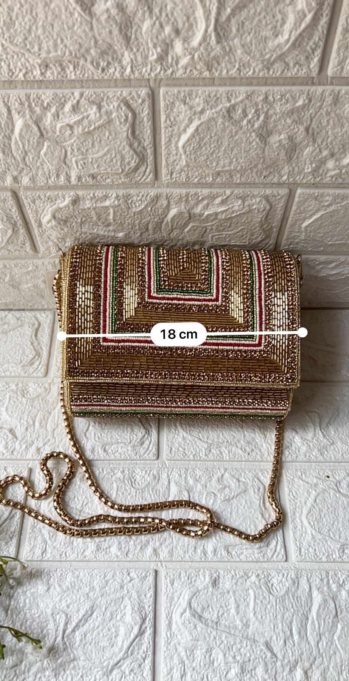 Elevate your look with our Simmer clutch. Handcrafted with beautiful golden and copper accents, this oriental-inspired clutch exudes luxury and sophistication. The detachable sling adds versatility, making it the perfect accessory for any party. Make a statement with our Simmer clutch.